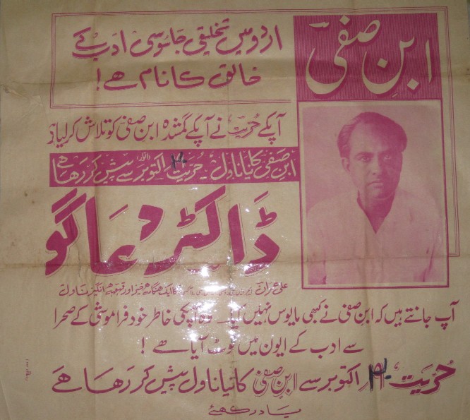 At this time editor of daily Hurriyat, Karachi, Janab Fakhr-e-Maatri persuaded Ibne Safi to write a novel for his newspaper. Ibne Safi agreed and Imran’s special novel Doctor Duago started publishing on weekly basis in daily Hurriyat. Fakhr-e-Maatri ensured that Ibne Safi’s comeback should be advertised properly so he published big posters that were glued at various bookstalls in Karachi and other parts of Pakistan.